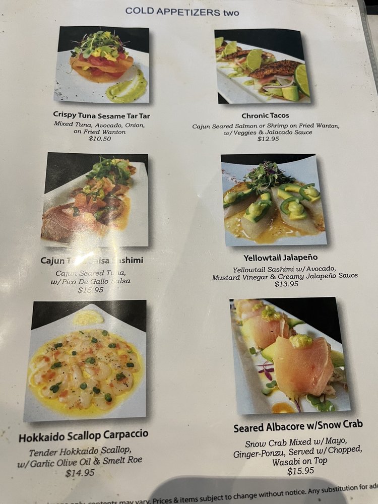 Inside: yellowtail tempura, krab mix. Outside: Cajun tuna, smelt roe and avocado. Sauce: special ponzu.