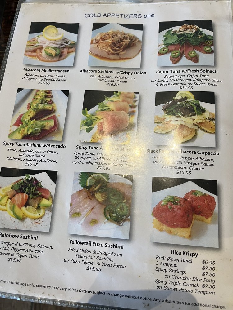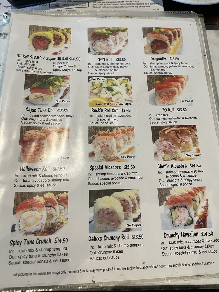 Inside: salmon and avocado. Outside: albacore baked with spicy mayo and smelt roe. Sauce: special ponzu.