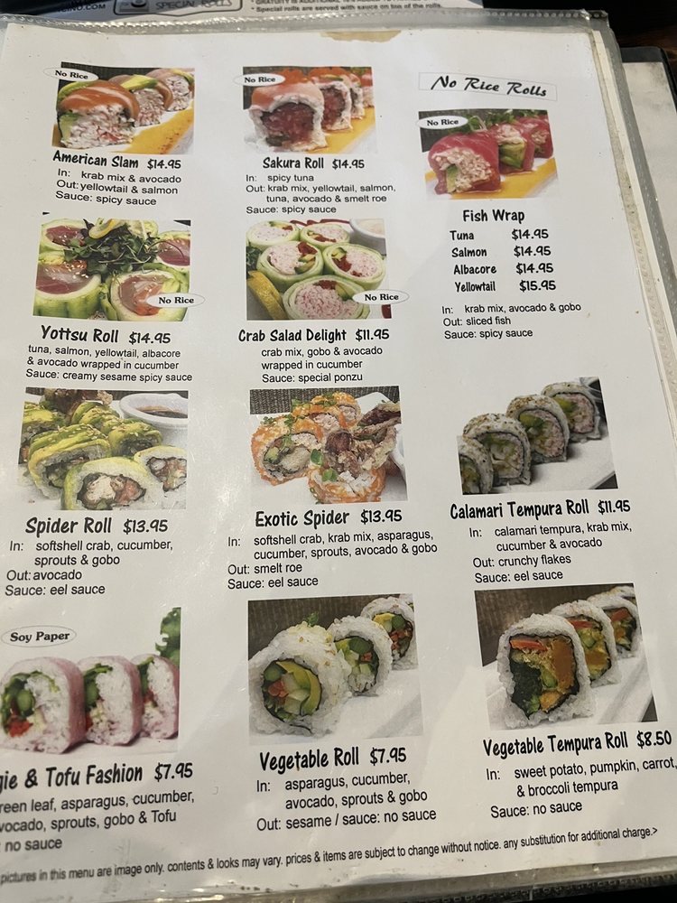 Inside: krab mix and avocado. Outside: tuna, yellowtail, salmon and avocado. Sauce: no sauce.