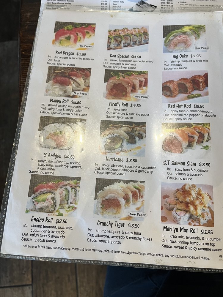 Soy paper. Inside: shrimp tempura and spicy tuna. Outside: albacore, avocado and crunchy flakes. Sauce: special ponzu.